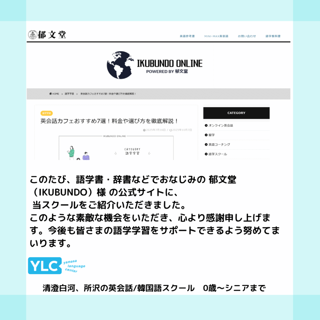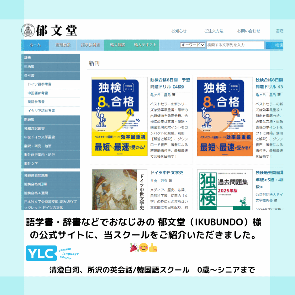 このたび、語学書・辞書などでおなじみの郁文堂(IKUBUNDO)様の公式サイトに、当スクールをご紹介いただきました。このような素敵な機会をいただき、心より感謝申し上げます。今後も皆さまの英会話、韓国語学習をサポートできるよう努めてまいります。